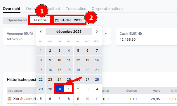 Via de website (niet via de app) kunt u via 2 muisklikken de waarde van uw portefeuille op een bepaalde dag raadplegen. In het lichtgrijs vindt u bovenaan in uw portefeuille een tabje "openstaand" voor uw actuele portefeuille, en u kan rechts daarvan kiezen voor "Historie". Bij "Historie" kunt u op elke datum de waarde (slotkoers) van elk effect in uw portefeuille terugvinden. Hieronder ziet u de stappen die u kan nemen om de historische waardes op 31/12/2025 terug te vinden.
