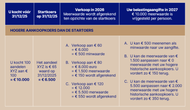Voor alle producten die u al in portefeuille had, wordt er een startkoers genomen van de waarde op 31 december 2025. Banken zullen de meerwaarde afrekenen ten opzichte van die startkoers.