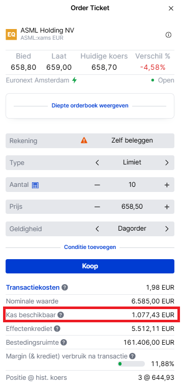 Geboekte plus niet geboekte cash worden weergegeven op de portefeuillepagina, aangeduid als "Cash (EUR)''. Niet geboekte transacties kunnen stortingen, opnames en verhandelde waarden omvatten.