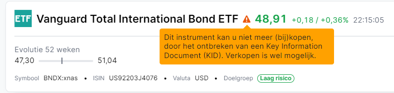 Belangrijk om te mogen worden aangeboden is dat er een KID bestaat in beide landstalen (Frans en Nederlands). Vindt u een onbeschikbare ETF en denkt u dat beide KID's bestaan, stuur ons gerust een support ticket met de twee KID's die u gevonden heeft, of de websites waar u deze heeft gevonden. Vaak kunnen wij een ETF toch openstellen voor aankoop.