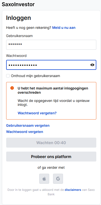 Na vijf onsuccesvolle pogingen om in te loggen op uw Saxo-rekening (door het invoeren van een onjuiste gebruikersnaam en/of wachtwoord), ontvangt u de volgende foutmelding: