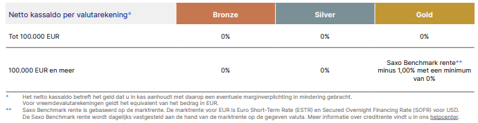 U kunt rente ontvangen over uw gehele netto kassaldo als u in het rekeningniveau Gold zit. Hiervoor is een netto kassaldo vereist van minimaal EUR 100.000 op een valutarekening. Eventueel aangehouden margin wordt in mindering gebracht op het kassaldo om te bepalen of u rente ontvangt.