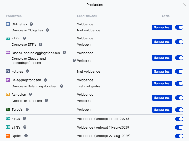Op de pagina Markten ziet u de producten die voor u beschikbaar zijn. Via > Beleggingsproducten kunt u de beschikbare producten aanzetten (of uitzetten wanneer u deze niet langer wilt zien).
