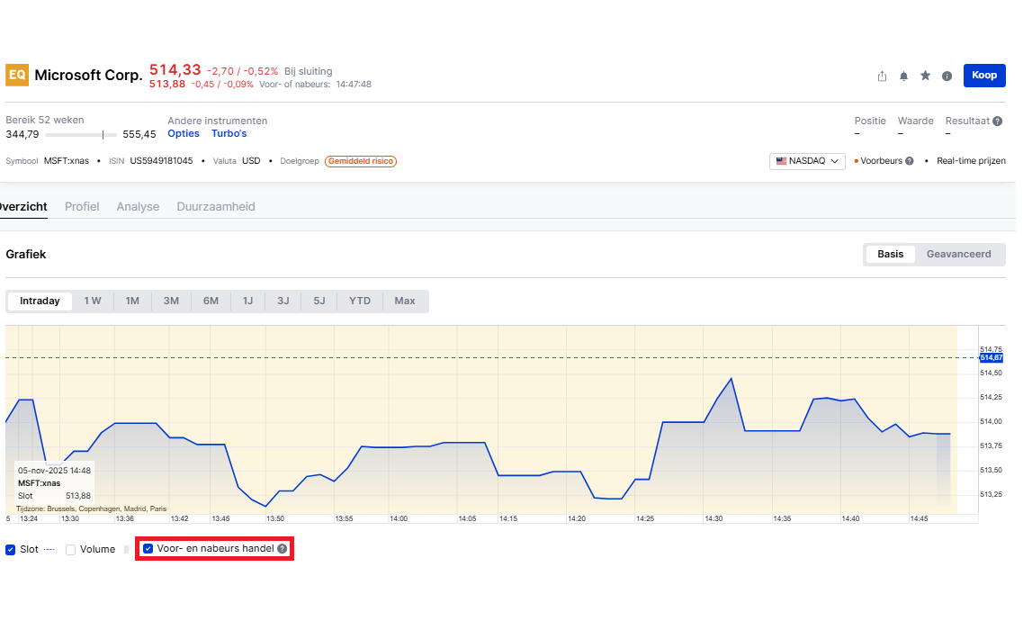 Houd er rekening mee dat handelen tijdens voor- en nabeurs gepaard gaat met grotere koersbewegingen. Dit komt omdat er een lagere liquiditeit, een hogere volatiliteit en vaak bredere spreads zijn op deze tijdstippen. Meer informatie over de bijkomende risico's leest u hier.