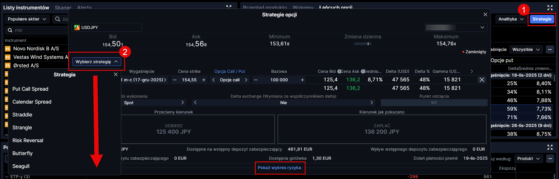 W zakładce Strategie Opcji możesz łatwo uzyskać dostęp do wykresu ryzyka, klikając Pokaż wykres ryzyka.