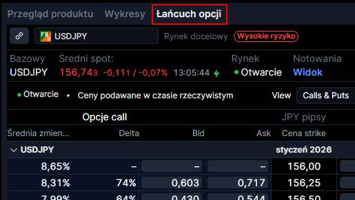 Wybierz instrument, taki jak akcja lub para walutowa (FX) > kliknij łańcuch opcji, który zostanie wyświetlony dla instrumentu bazowego.
