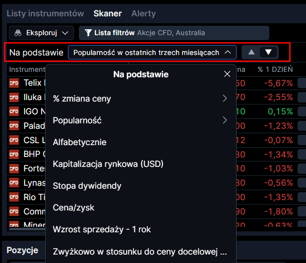 Po dodaniu wszystkich filtrów możesz sortować wyniki według % zmiany ceny, popularności, alfabetycznie i wielu innych kryteriów.