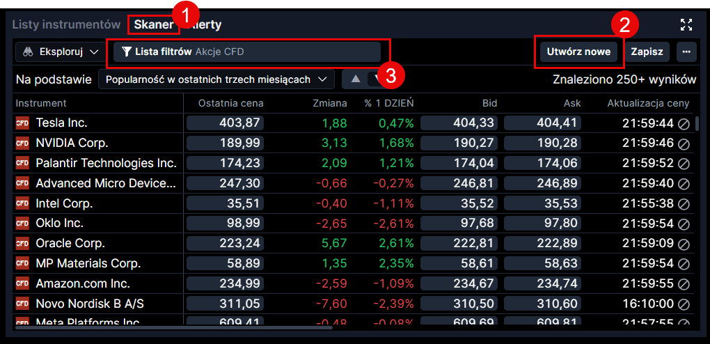 Lista obserwacyjna to spersonalizowana lista instrumentów finansowych, takich jak akcje, obligacje, towary czy waluty, które chcesz monitorować. Umożliwia śledzenie wyników i ruchów cenowych wybranych instrumentów bez konieczności ich wielokrotnego wyszukiwania.