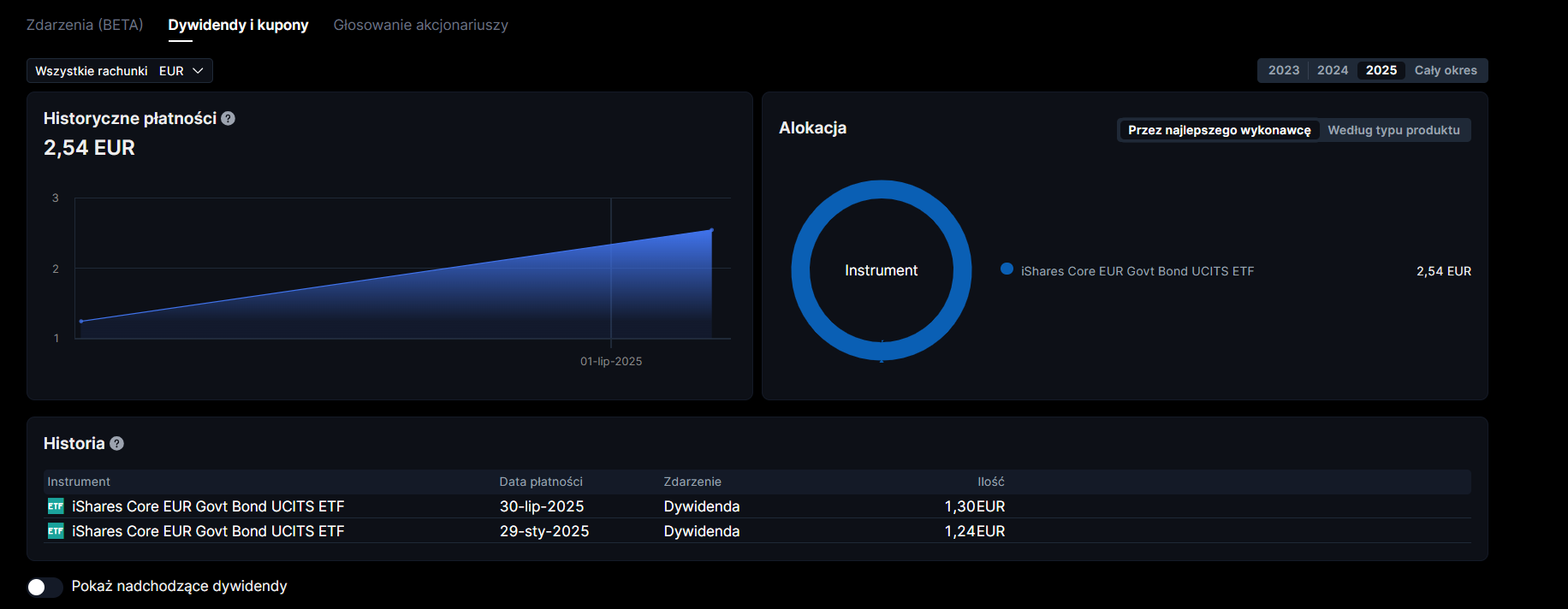 Panel Dywidend i Kuponów zapewnia skonsolidowany widok na dochody związane z działania korporacyjnymi, w tym zarówno dywidendy, jak i płatności kuponowe z obligacji.