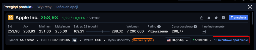 Pod instrumentem zobaczysz oznaczenie „opóźnione o 15 minut” (akcje i opcje na akcje) lub „opóźnione o 10 minut” (futures).