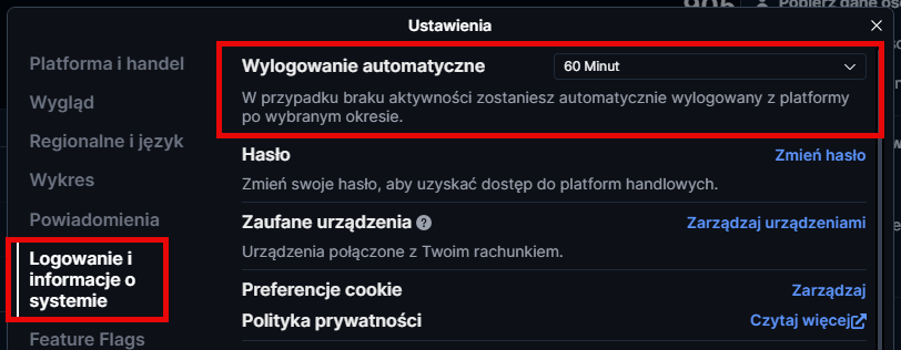 Aby dostosować ustawienia, przejdź do Mój profil , klikając ikonę profilu > w Ustawieniach kliknij Ustawienia platformy > kliknij Logowanie i informacje o systemie > w sekcji Automatyczne wylogowanie u góry możesz łatwo wydłużyć lub skrócić czas przed automatycznym wylogowaniem.