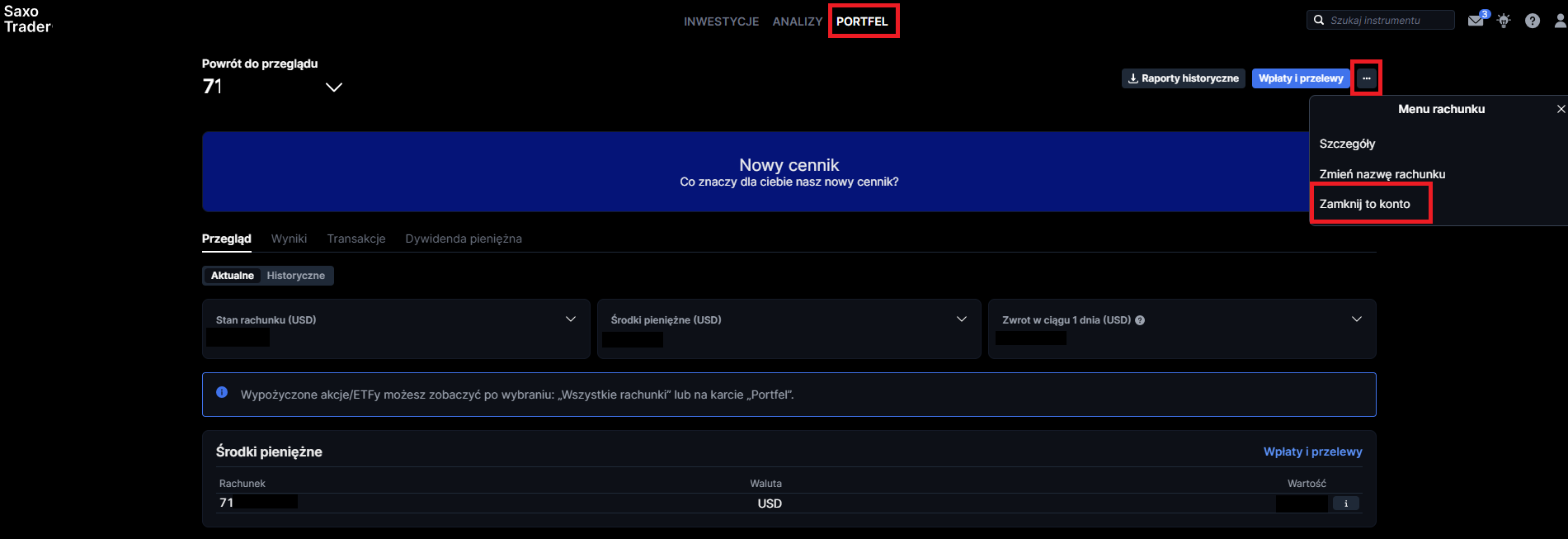 SaxoTrader na komputery stacjonarne: kliknij na menu główne >przejdź do Moje konto > Poproś o usługi dotyczące konta > kliknij Zamknij swoje konto w Saxo