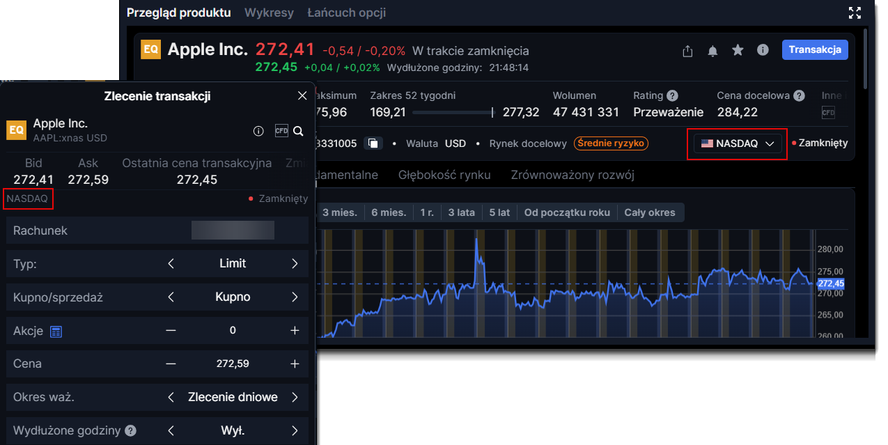 Wybierz instrument i zobacz giełdę w przeglądzie produktu lub poprzez bilet transakcyjny.