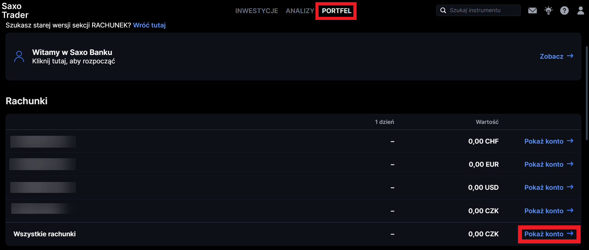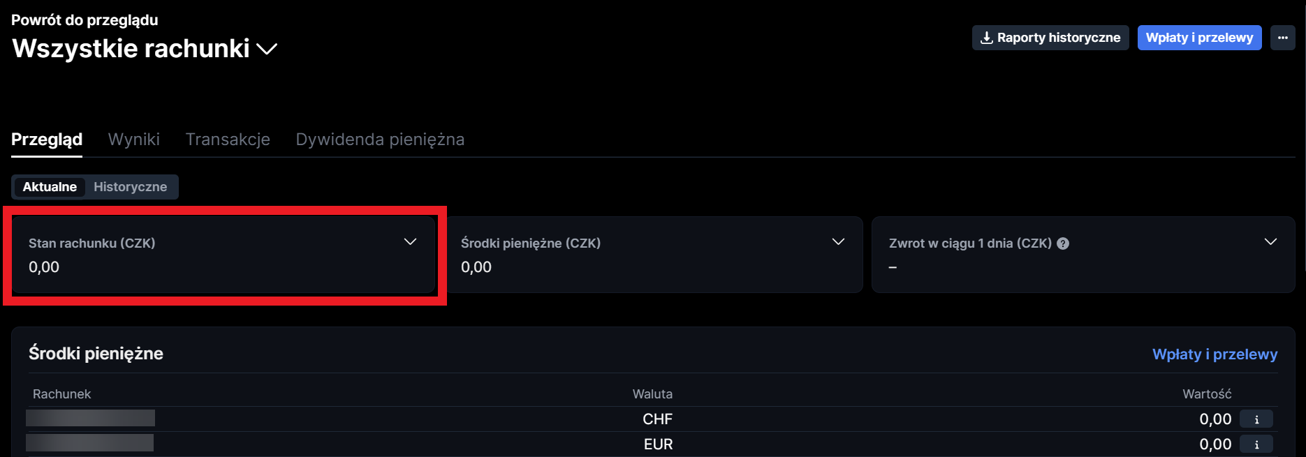 Możesz znaleźć wartość swojego konta w sekcji Portfel > W Rachunki kliknij Pokaż konto > Teraz możesz zobaczyć podsumowanie i Stan Rachunku, jak pokazano poniżej: