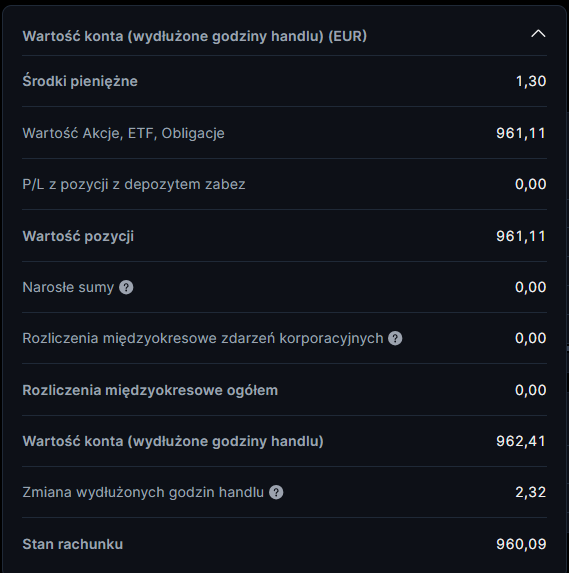 Prosimy zauważyć, że wartość pozycji w szczegółach konta może różnić się od wartości w module Pozycji. Jest to spowodowane tym, że szczegóły konta pokazują wartości w czasie rzeczywistym, a moduł Pozycji może używać opóźnionych cen w zależności od Twojej subskrypcji danych rynkowych.