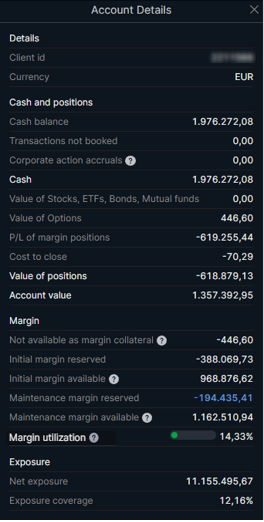 Wykorzystanie depozytu utrzymania = (100 x Zarezerwowany depozyt utrzymania) / (Wartość rachunku + Inne zabezpieczenie – Niedostępne jako zabezpieczenie depozytu)