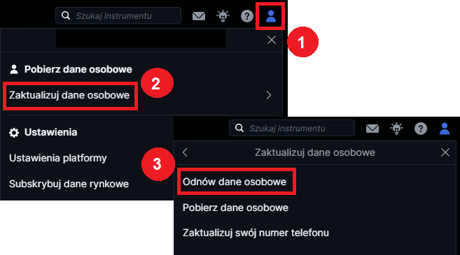 Jak przesłać brakujące informacje w celu aktualizacji dokumentacji? Zaktualizowano 3/12/2025 11:35 Aby przesłać brakujące informacje, prosimy o postępowanie zgodnie z następującymi krokami: Przejdź do menu głównego > Zaktualizuj dane osobowe > Odnów dane osobowe Przykład z SaxoTrader