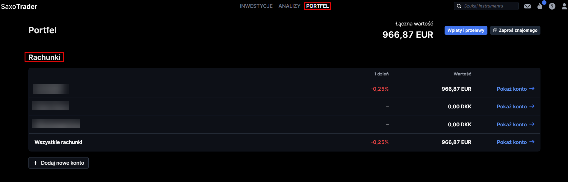 Przegląd rachunku przedstawia Ci szybki status wartości rachunku i zmian w ciągu 1 dnia zarówno na poziomie pojedynczego, jak i zagregowanego rachunku.