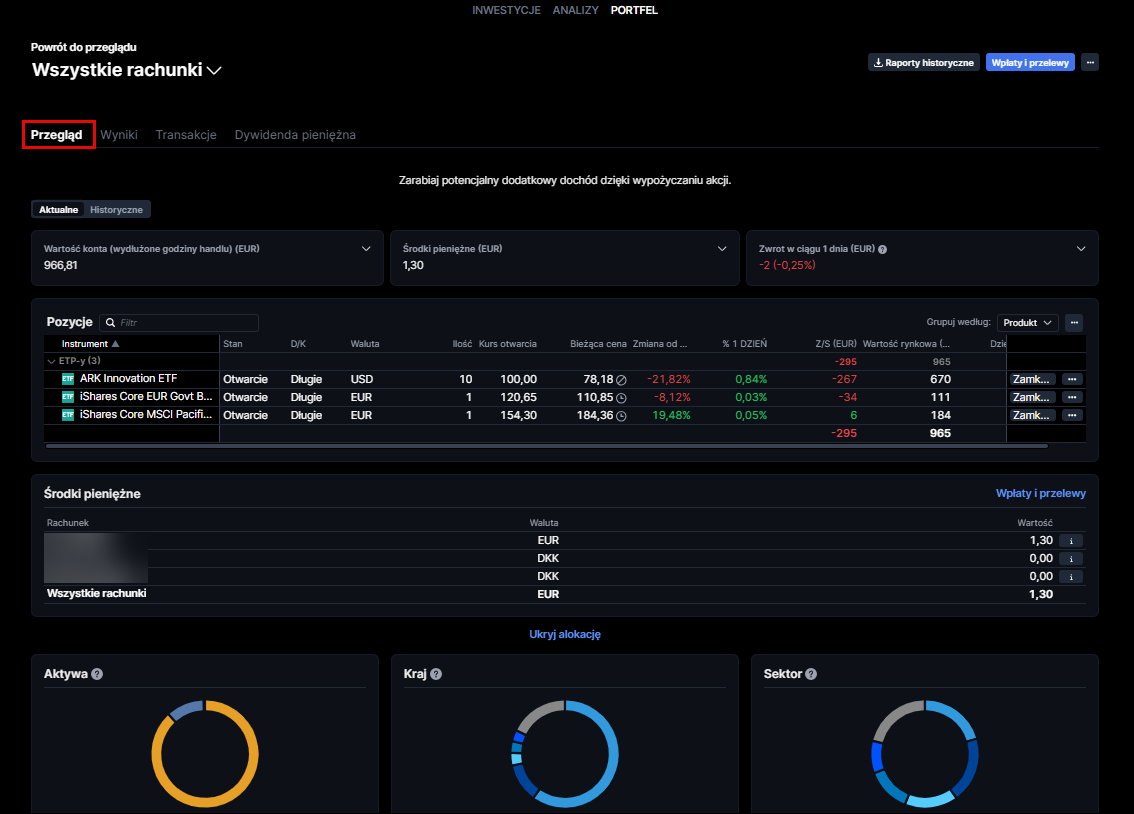 Na górze sprawdzisz ogólną wartość konta, dostępne środki pieniężne oraz jednodniowy zwrot. Poniżej zobaczysz pozycje wyświetlane według klasy aktywów, jak również podział posiadanych środków pieniężnych. Wreszcie, na samym dole, zobaczysz wykresy alokacji, które pokazują, z czego składa się Twój portfel w podziale na aktywa, kraje i sektory.