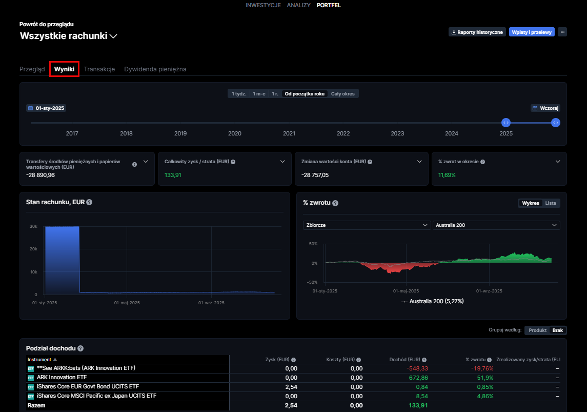 Ta sekcja dostarcza szczegółowego zestawienia historycznych wyników Twojego rachunku w wybranym przez Ciebie okresie czasu. Możesz zobaczyć zmiany wartości Twojego konta i stopę zwrotu na dwóch wykresach. Dla wykresu stopy zwrotu możesz dodać benchmark, z którym porównasz wyniki. Klikając na instrument, uzyskasz więcej informacji na temat zysków, stopy zwrotu i historii transakcji dla danego instrumentu.