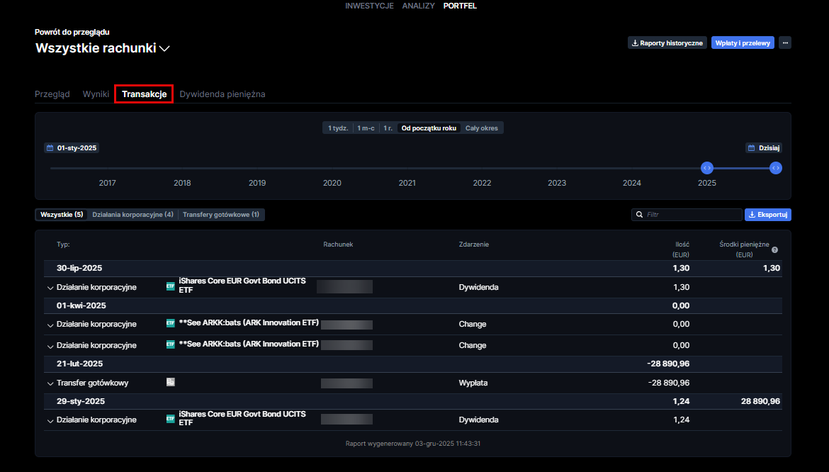 Sekcja transakcji pokazuje listę wszystkich zdarzeń, które miały wpływ na Twoje konto. Przegląd transakcji można dostosować za pomocą filtrów: okres, produkt i typ transakcji. Aby uzyskać szczegółowe zestawienie pojedynczej transakcji, kliknij na nią, a to spowoduje wyświetlenie szczegółów transakcji.