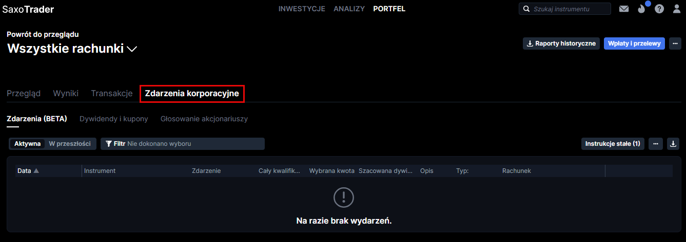 Zakładka Zdarzenia korporacyjne to miejsce, w którym znajdziesz informacje o działaniach związanych z zdarzeniami korporacyjnymi, takimi jak dywidendy i głosowania akcjonariuszy. Tutaj zobaczysz swoje nadchodzące, aktywne i przeszłe zdarzenia korporacyjne i zorientujesz się, czy należy podjąć jakieś działania.