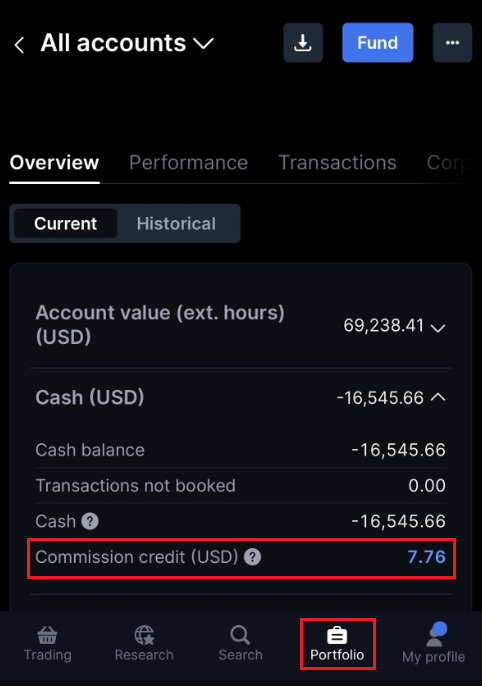 W zakładce Inwestycje > Kliknij "i" w dolnym lewym rogu, aby zobaczyć Szczegóły konta > W sekcji Szczegóły, zobacz Kredyt prowizyjny.