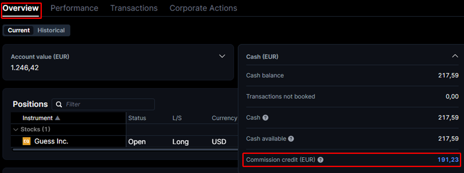 Kliknij na Portfel > Wybierz konto > W sekcji Podsumowanie, kliknij Gotówka > Zobacz Kredyt prowizyjny.