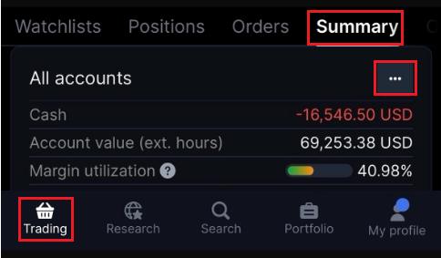 W zakładce Inwestycje na dole > Wybierz Podsumowanie na górze > Kliknij ikonę z trzema kropkami, aby zobaczyć Szczegóły konta > Zobacz Kredyt prowizyjny.