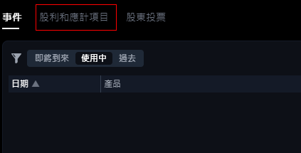 您可以查看企業行動中待支付的事件項目。股利支付後,該事件將從「股息和應計費用」標籤中消失。這將包括事件類型、工具、扣除的費用、支付金額等。