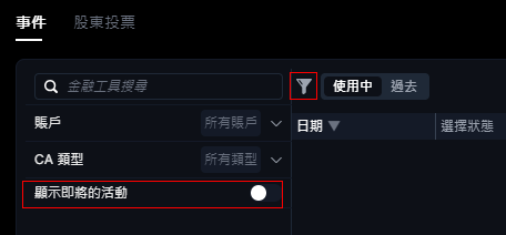 - 使用中 :已通過並啟動的企業行動。如果是自願型企業行動事件,您需要在2個或多個選項內投票。如果您未在截止日前完成投票,該企業行動事件將根據預設選項執行。